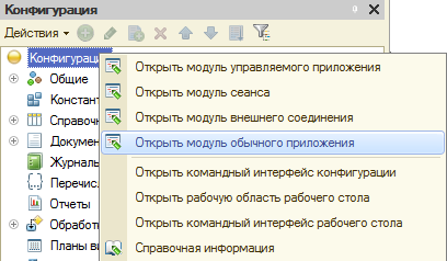Для проверки работоспособности компоненты откройте вашу конфигурацию в режиме Конфигуратора, кликните правой кнопкой на узле «Конфигурация» и выберите в появившемся меню пункт «Открыть модуль обычного приложения».
