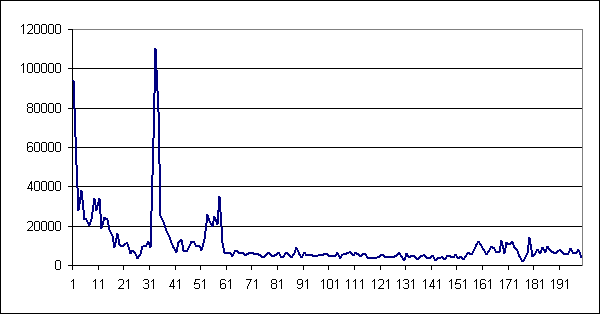 Ярковыраженный всплеск в области 32 млн. соответствует периоду прохождения словарей