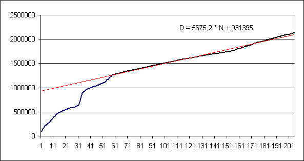 Проведя линейную аппроксимацию по области за 60 млн. слов,