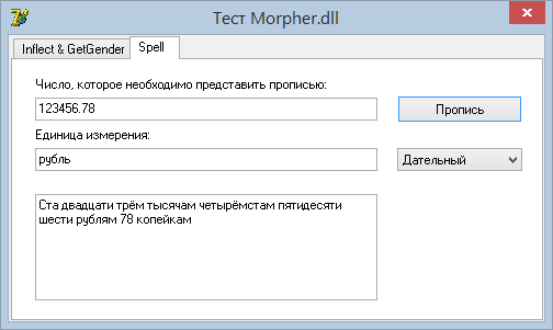 Подключить функции склонения к вашей программе на Дельфи очень просто – достаточно поместить библиотеку Morpher.dll в рабочий каталог программы, подключить модуль Morpher.pas и в вашем распоряжении окажется функция склонения Inflect: