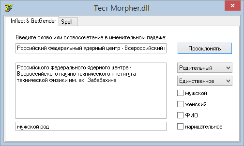 Библиотека Morpher.dll служит для склонения фамилий, имен и отчеств, а также наименований должностей, отделов, организаций и практически всего, что склоняется в русском языке (подробнее о технологии склонения).